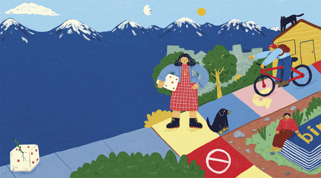 Avanzó tres cuadras. Calles cortadas. Retroceda dos. Tarjeta: «Manifestación en Plaza Dignidad. Pierde un turno». Los dados giran. Le toca Maipú. Lluvia. Tacones embarrados. Consigue una bici. Cruza a Ñuñoa. Tarjeta: «Se le acaba la tarjeta Bip». Volver al inicio. La ciudad es un tablero gastado, con reglas cambiantes. Algunos nacen con comodines. Otros solo lanzan dados rotos. Pero él sigue jugando, esquivando casillas trampa, dibujando rutas propias. Nadie gana en este juego. Pero perder también cansa. Tira el dado una vez más. Y avanza.